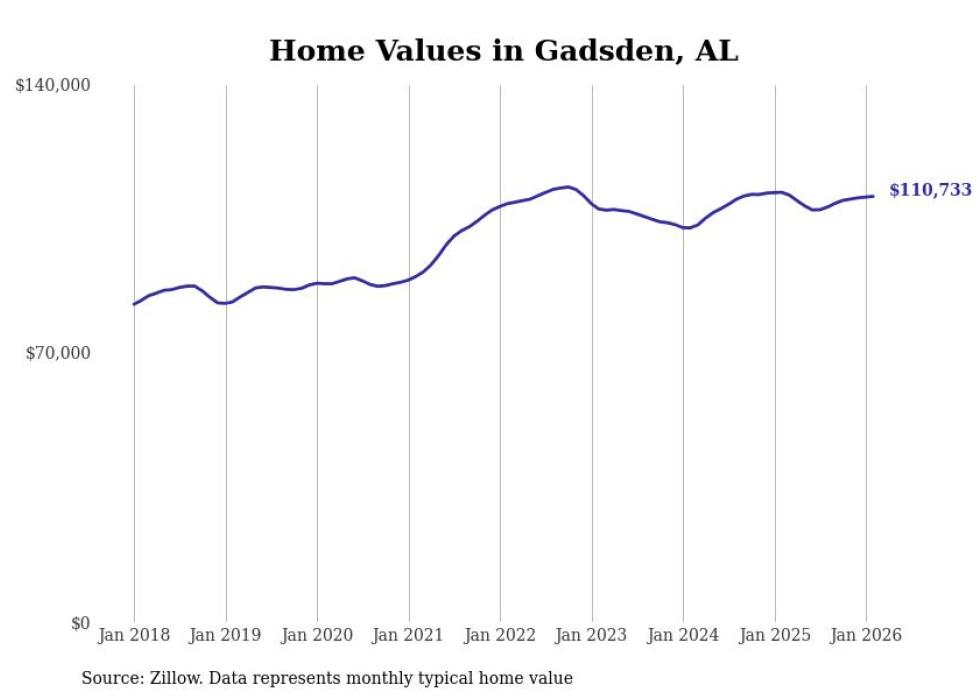 compiled a list of cities with the most expensive homes in the Gadsden metro area using data from . Charts show the monthly typical home value since January 2018. All 10 cities and towns with data available were included in the list.