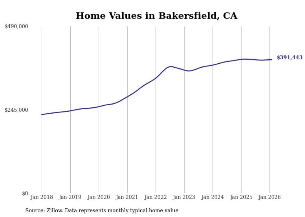 compiled a list of cities with the most expensive homes in the Bakersfield, CA metro area using data from . Charts show the monthly typical home value since January 2018.