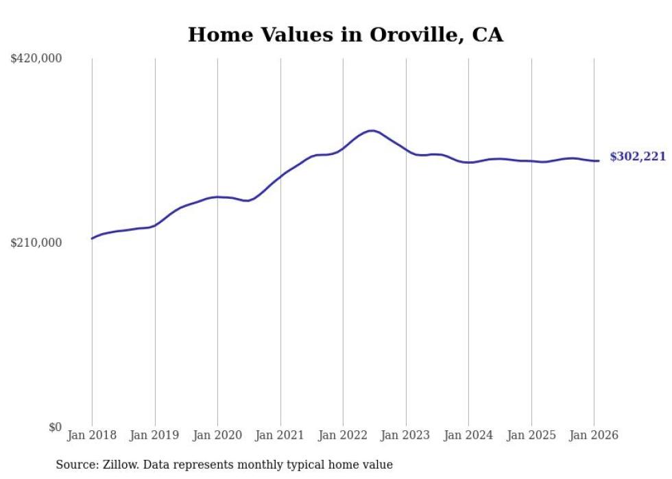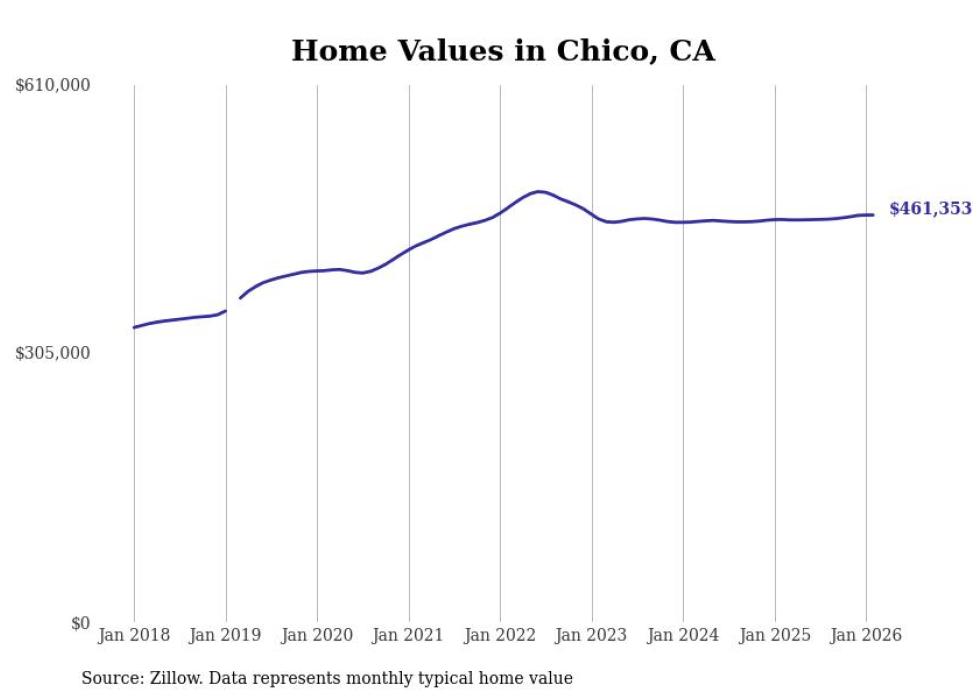 compiled a list of cities with the most expensive homes in the Chico, CA metro area using data from . Charts show the monthly typical home value since January 2018.