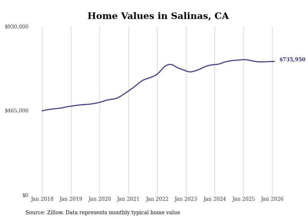 compiled a list of cities with the most expensive homes in the Salinas metro area using data from . Charts show the monthly typical home value since January 2018. All 20 cities and towns with data available were included in the list.