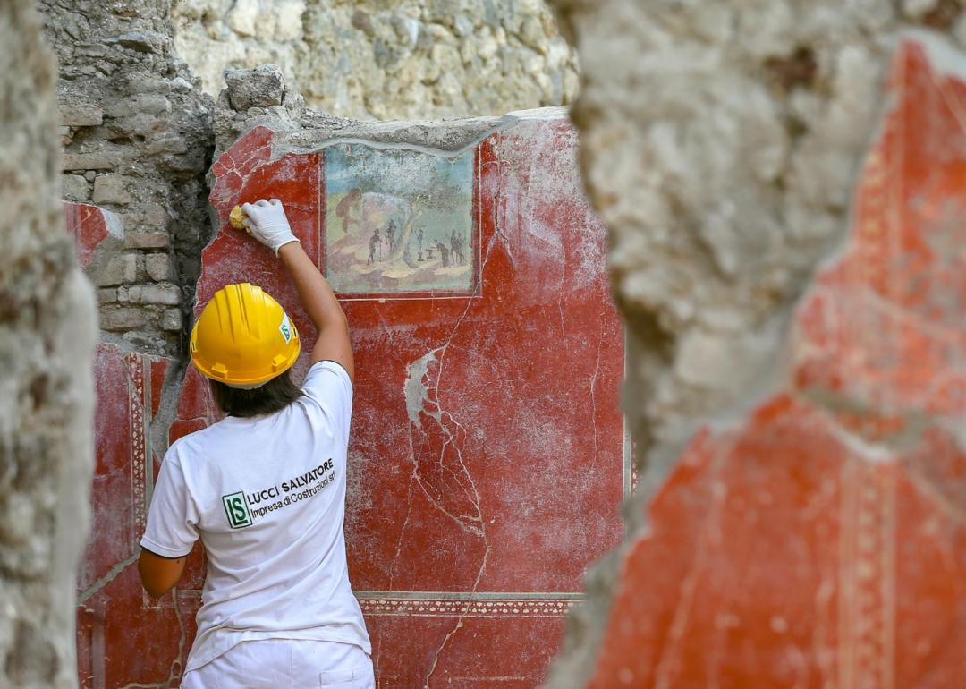When Mount Vesuvius erupted in A.D. 79, it preserved the Roman city of Pompeii (along with the final moments of its fated residents) under a roughly 20-foot layer of pumice stone and ash. The archeological site, which includes fresco-covered homes, was discovered more than 1,400 years later by architect Domenico Fontana. Now a popular tourist site, the archeological site of Pompeii offers an understanding of cultural, religious, and political life in this ancient city.