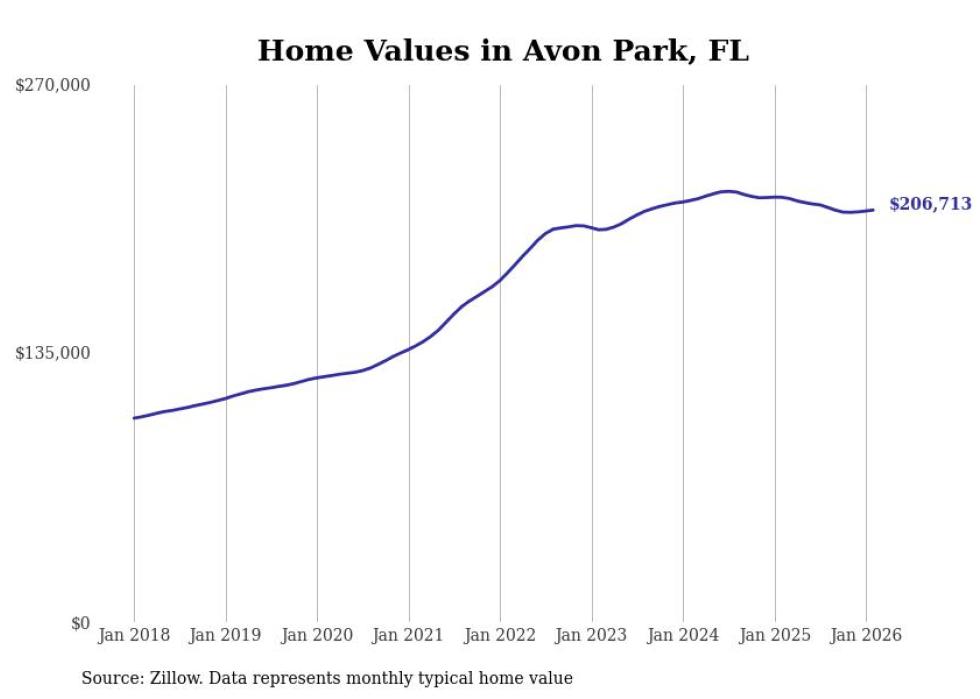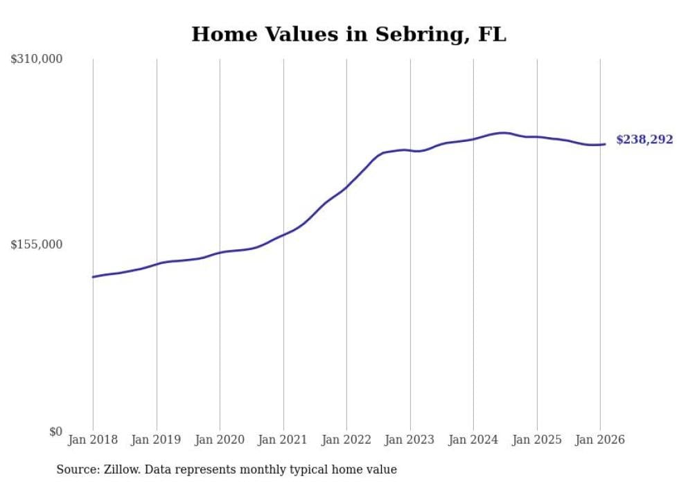 compiled a list of cities with the most expensive homes in the Sebring metro area using data from . Charts show the monthly typical home value since January 2018. All 5 cities and towns with data available were included in the list.