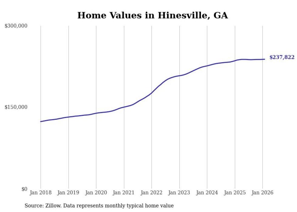compiled a list of cities with the most expensive homes in the Hinesville metro area using data from . Charts show the monthly typical home value since January 2018. All 8 cities and towns with data available were included in the list.