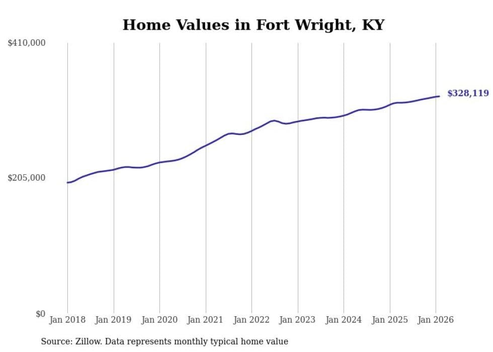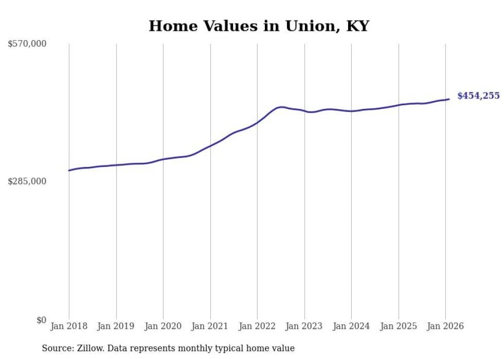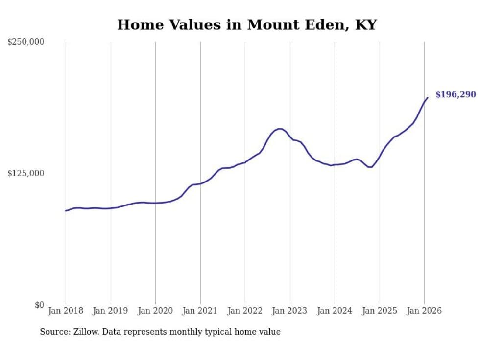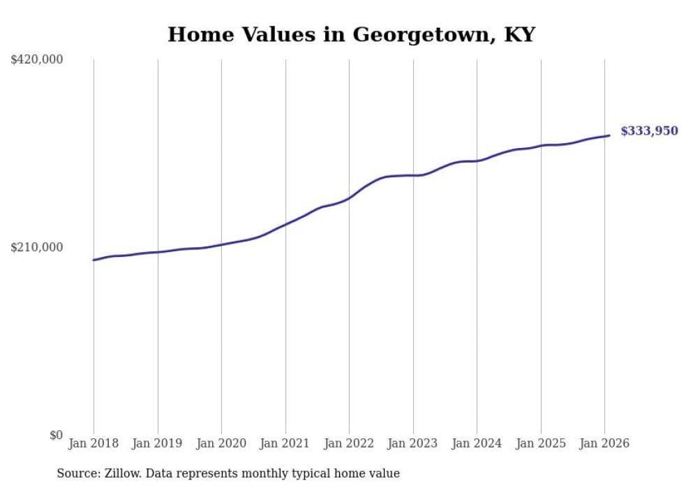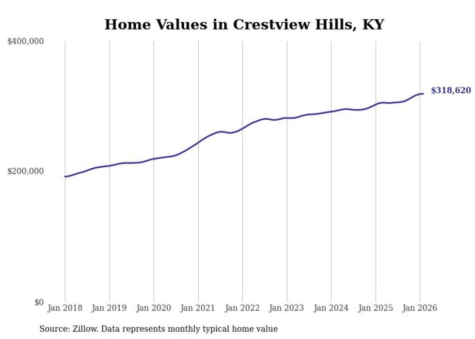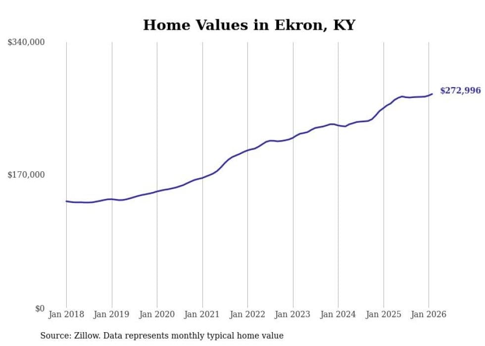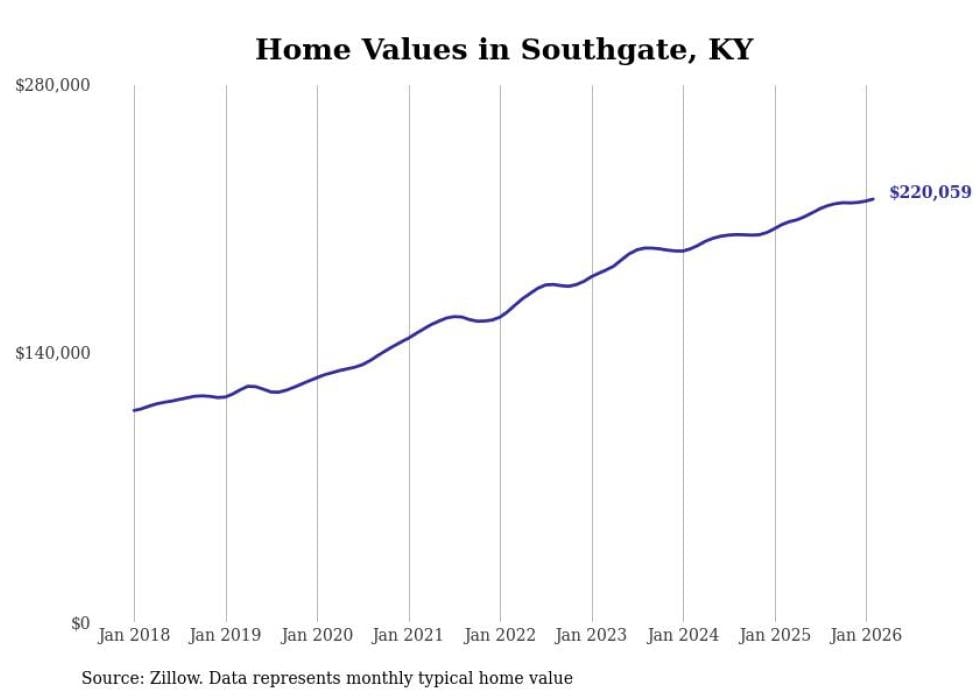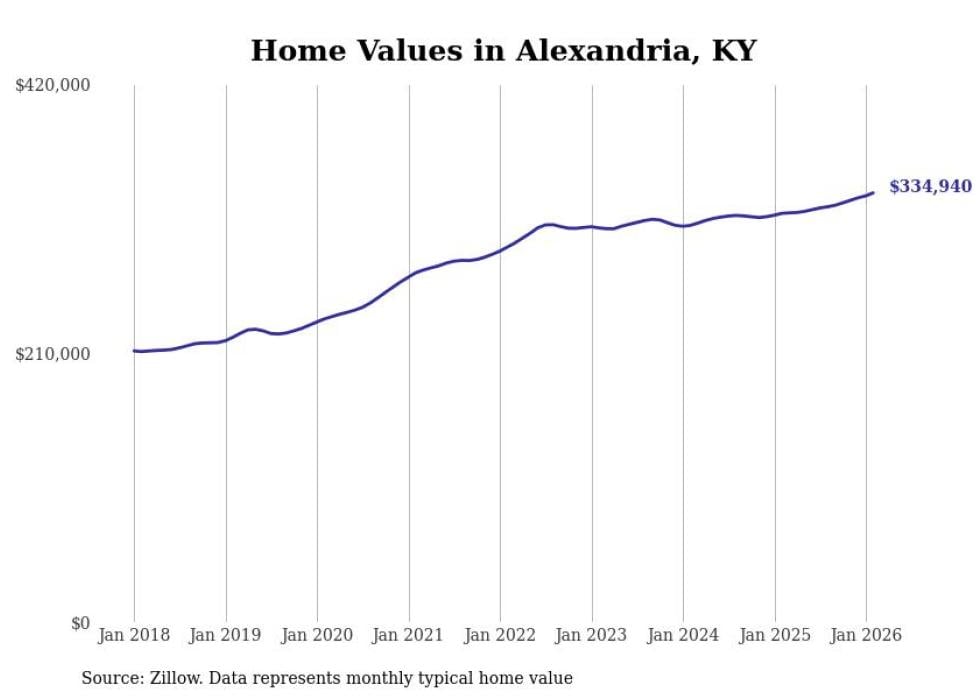 compiled a list of cities with the fastest-growing home prices in Kentucky using data from . Cities are ranked by the dollar change in the Zillow Home Values Index for all homes from the 12 months ending February 2026. The charts in this story were created automatically using . Data was available for 50 cities and towns in Kentucky.