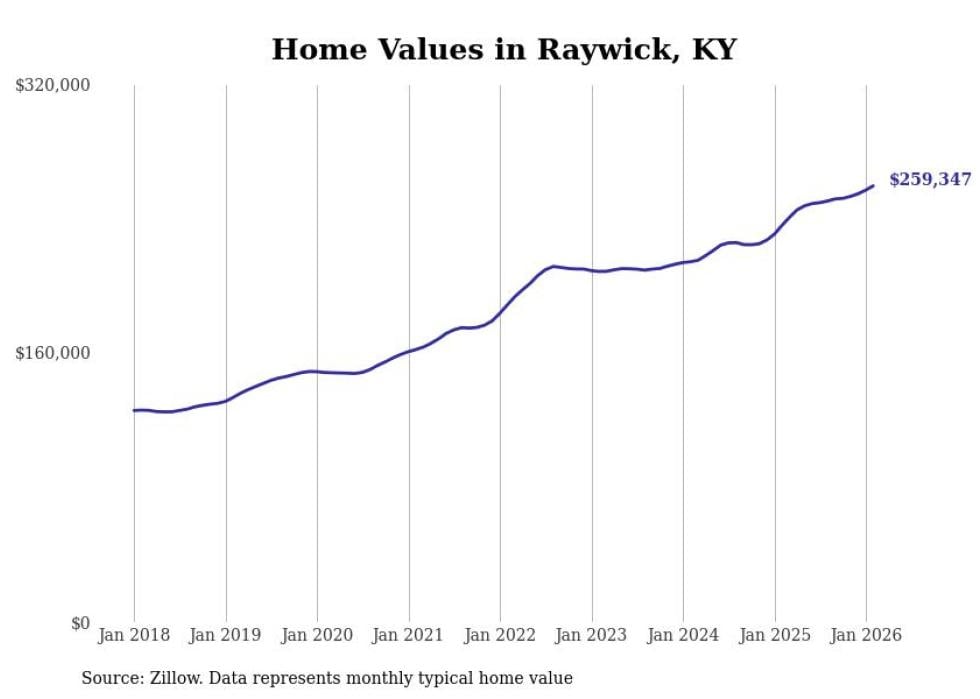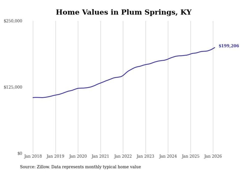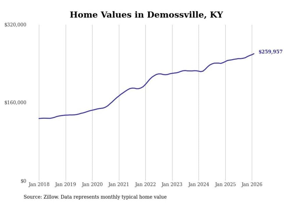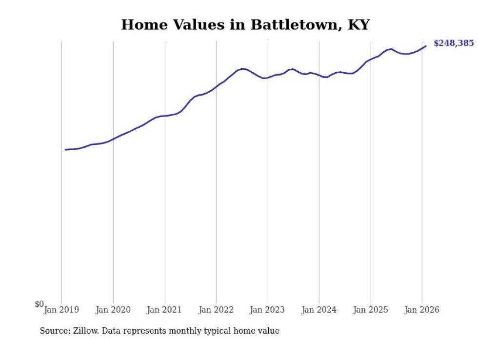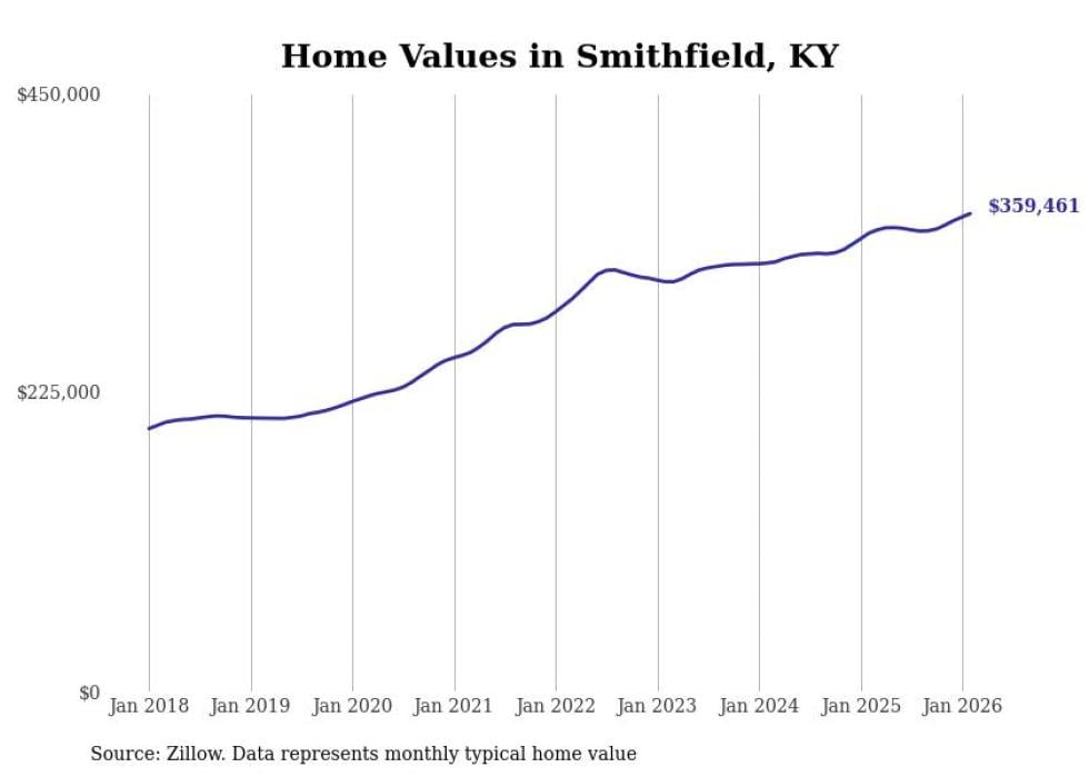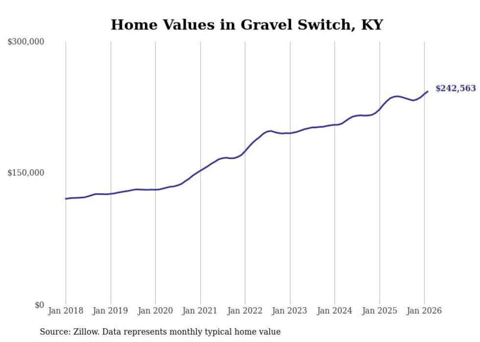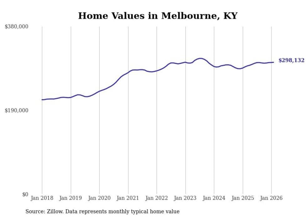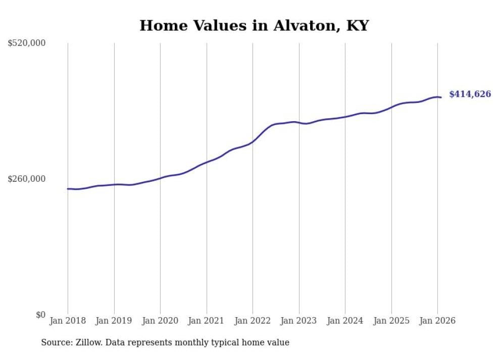 compiled a list of cities with the fastest-growing home prices in Kentucky using data from . Cities are ranked by the dollar change in the Zillow Home Values Index for all homes from the 12 months ending February 2026. The charts in this story were created automatically using . Data was available for 50 cities and towns in Kentucky.