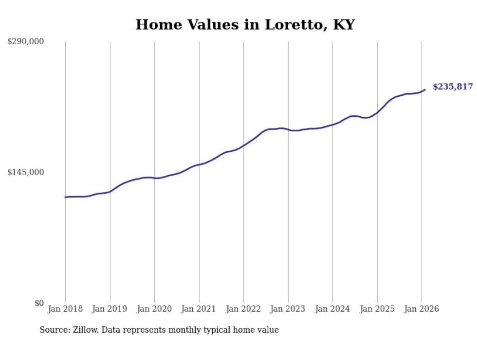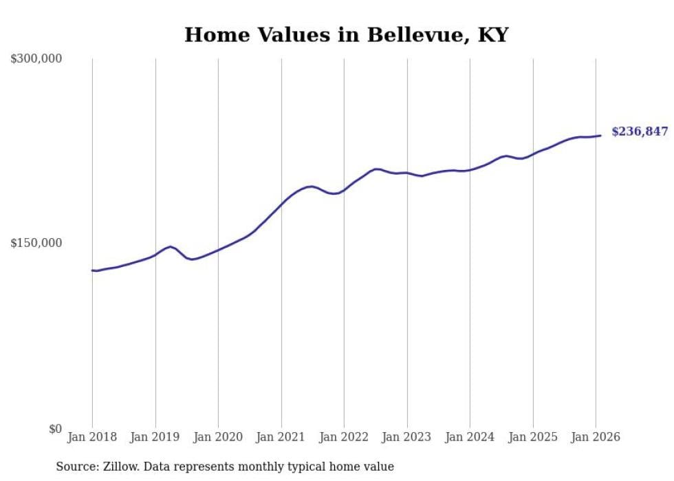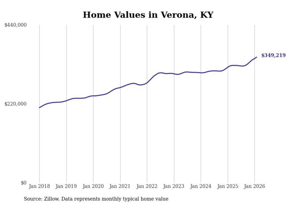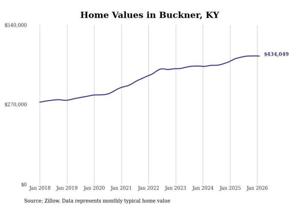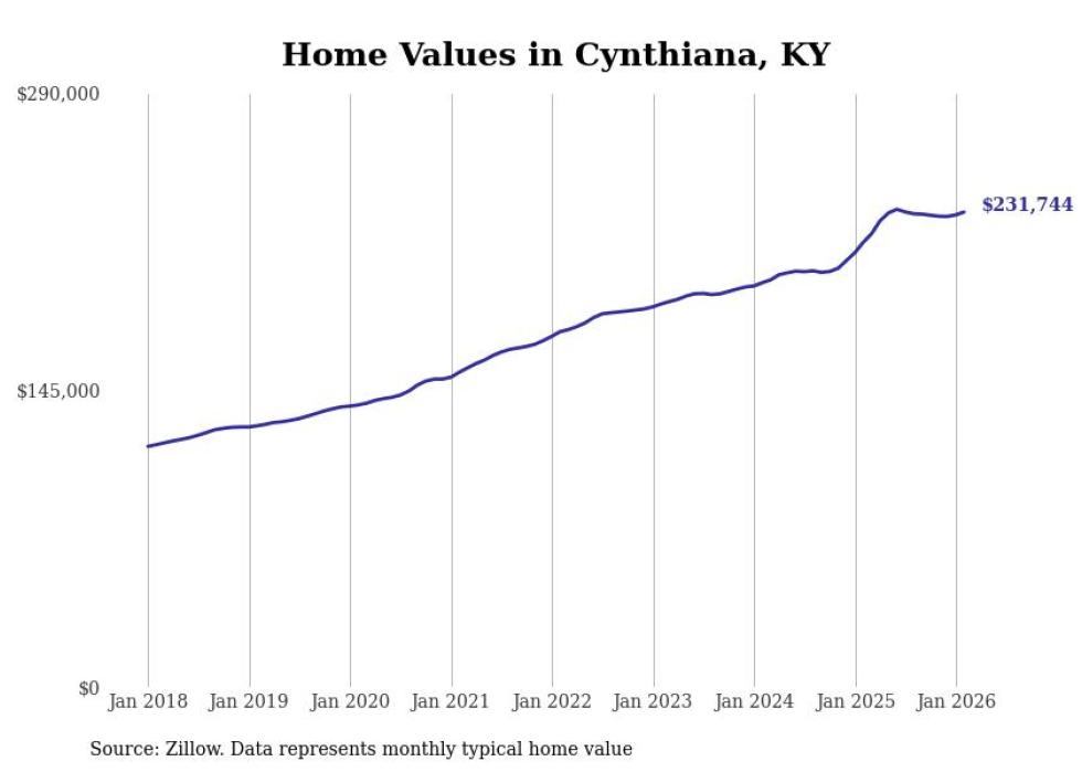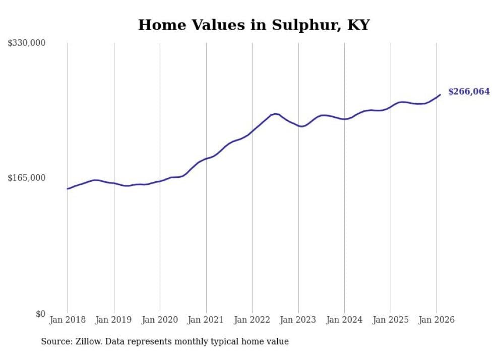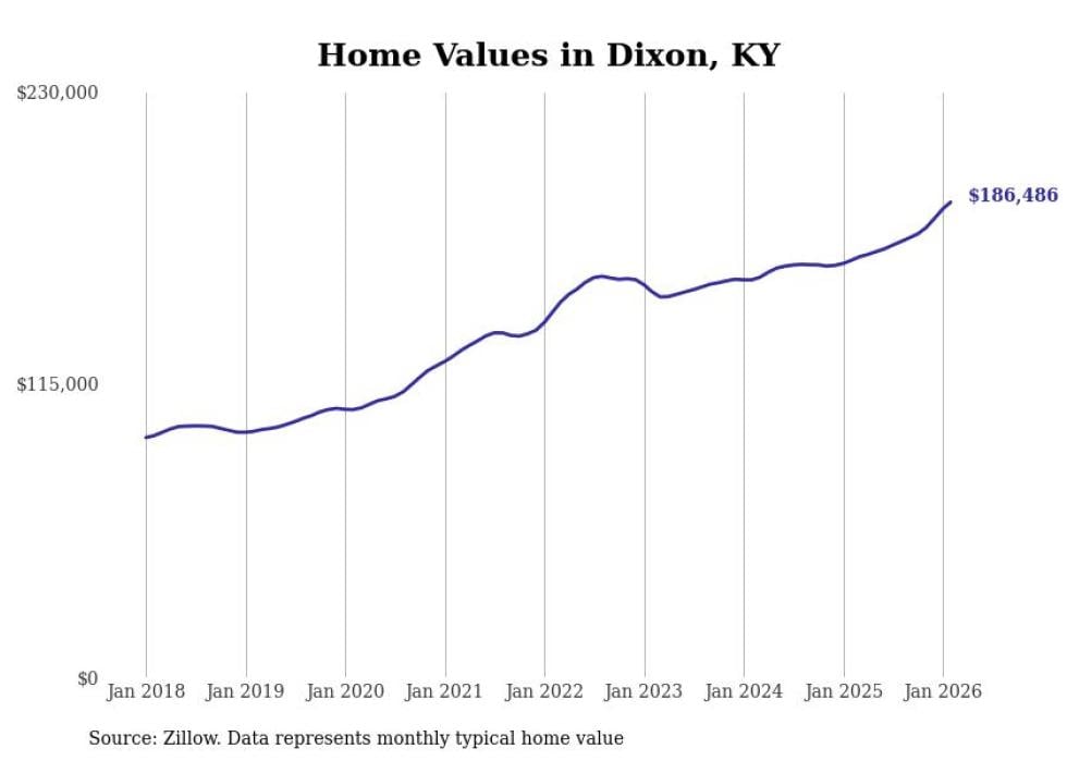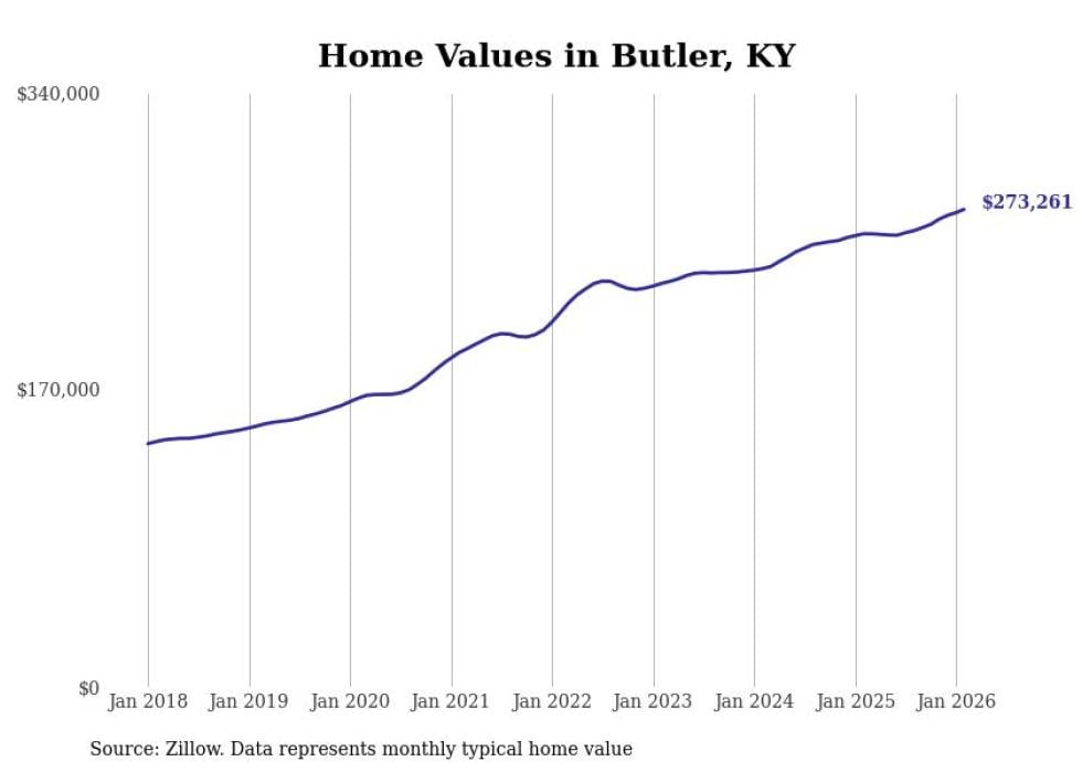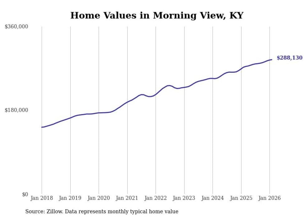 compiled a list of cities with the fastest-growing home prices in Kentucky using data from . Cities are ranked by the dollar change in the Zillow Home Values Index for all homes from the 12 months ending February 2026. The charts in this story were created automatically using . Data was available for 50 cities and towns in Kentucky.