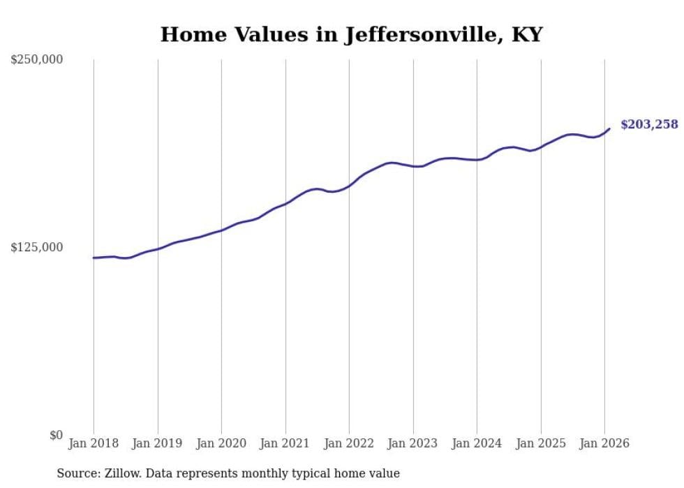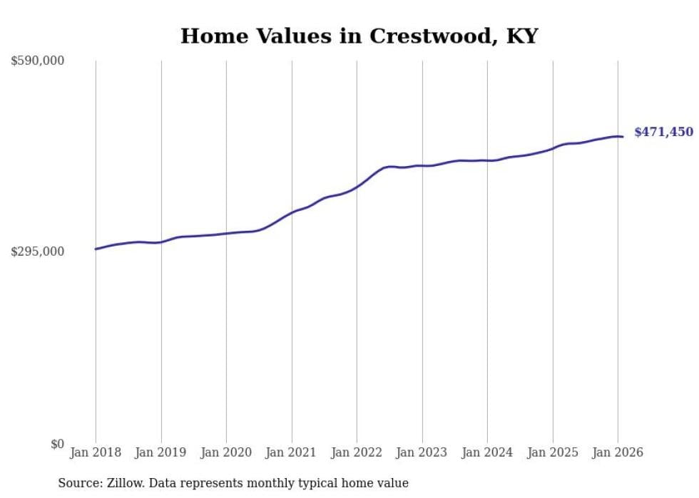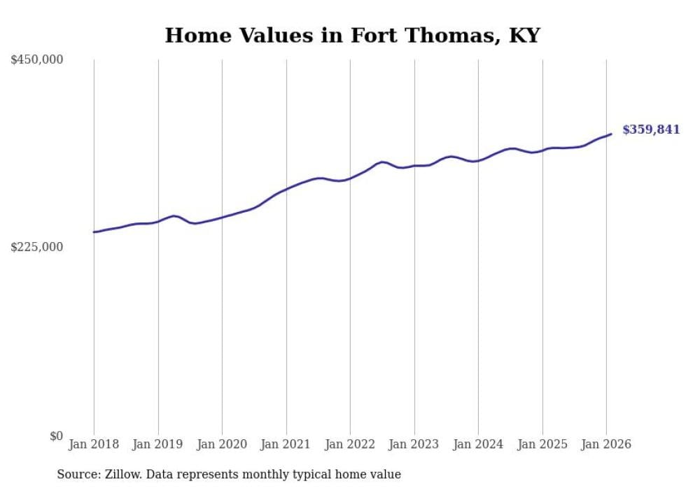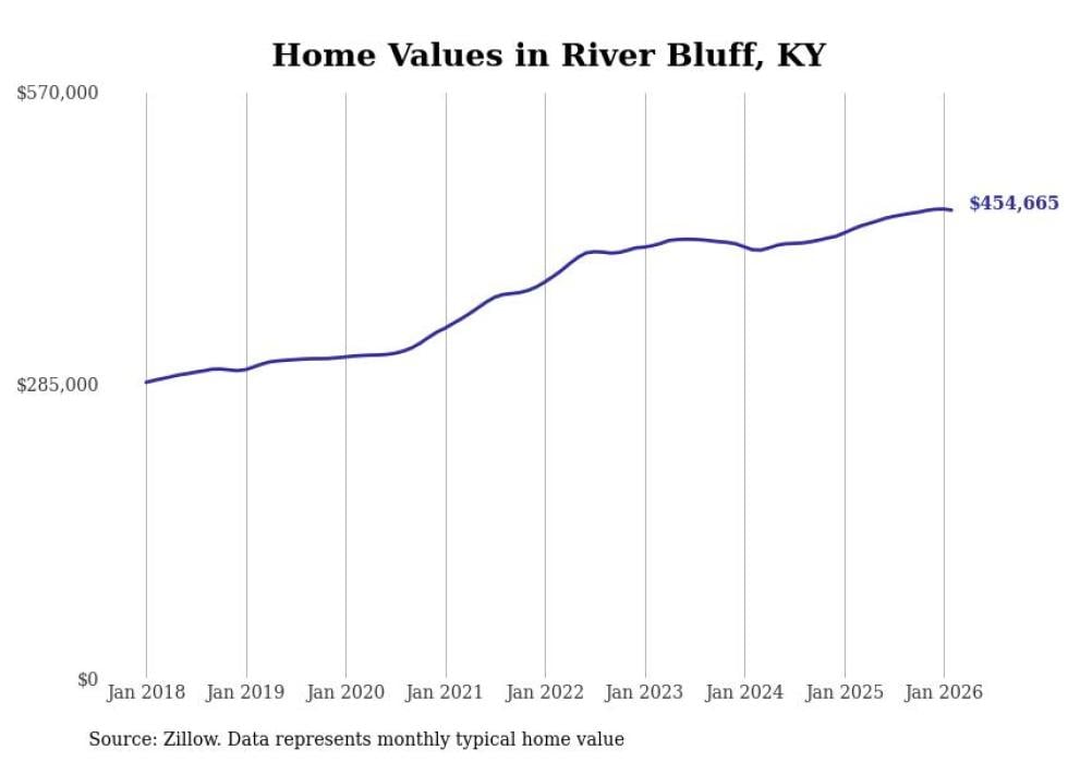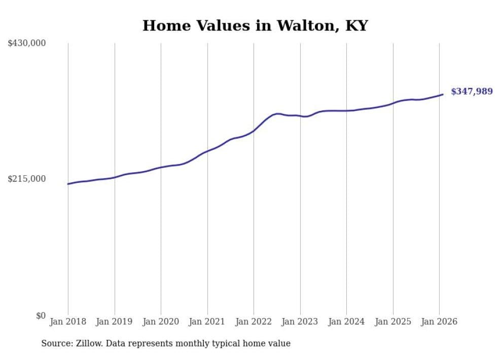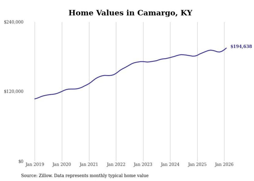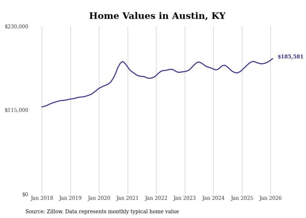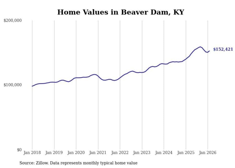 compiled a list of cities with the fastest-growing home prices in Kentucky using data from . Cities are ranked by the dollar change in the Zillow Home Values Index for all homes from the 12 months ending February 2026. The charts in this story were created automatically using . Data was available for 50 cities and towns in Kentucky.