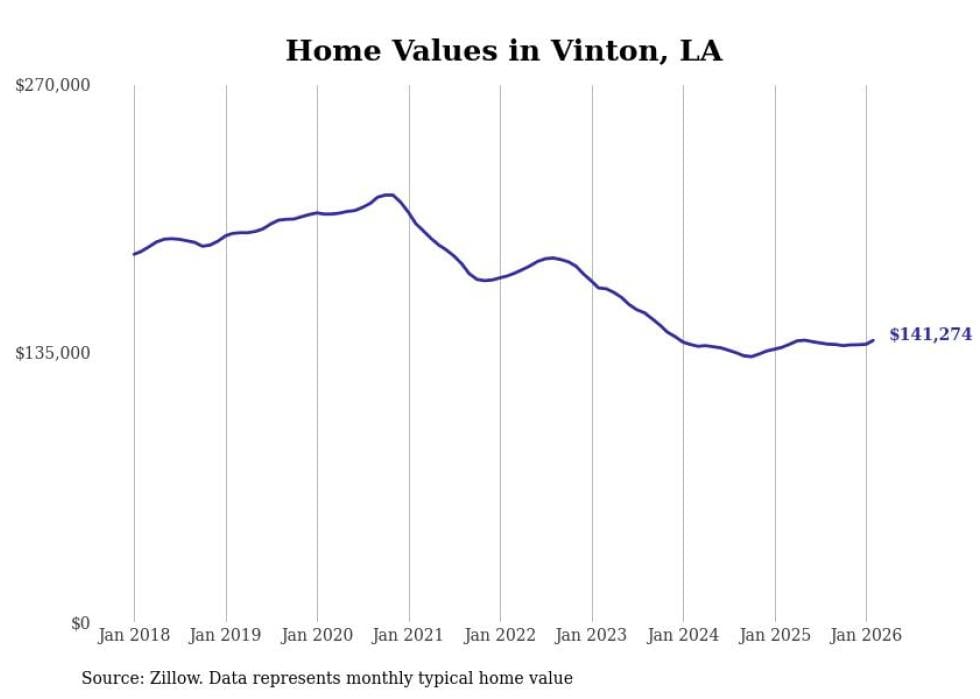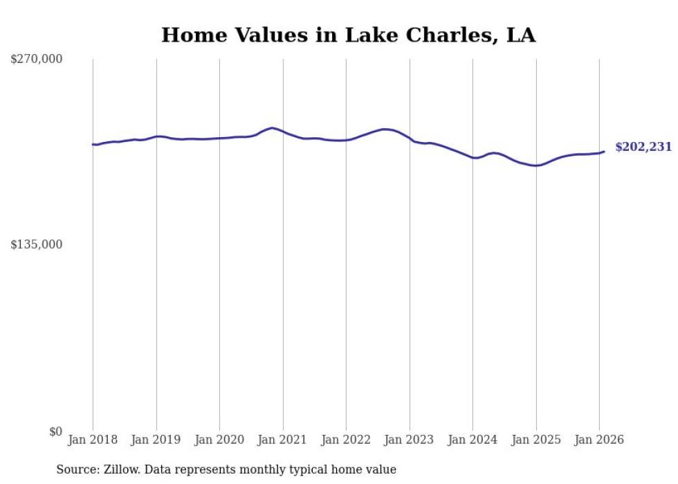 compiled a list of cities with the most expensive homes in the Lake Charles, LA metro area using data from . Charts show the monthly typical home value since January 2018.
