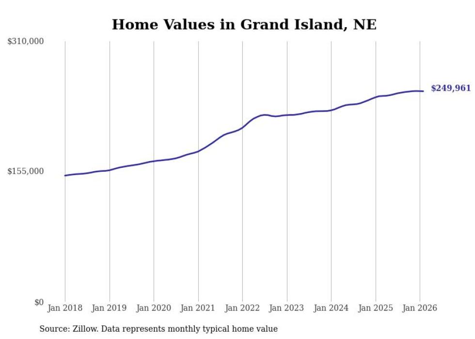 compiled a list of cities with the most expensive homes in the Grand Island metro area using data from . Charts show the monthly typical home value since January 2018. All 14 cities and towns with data available were included in the list.