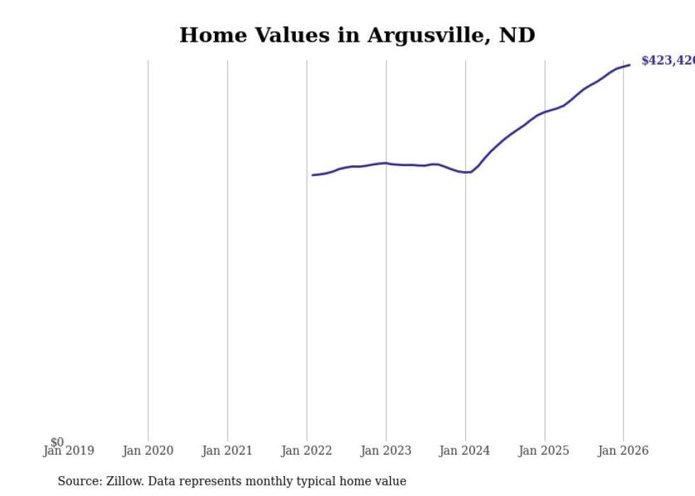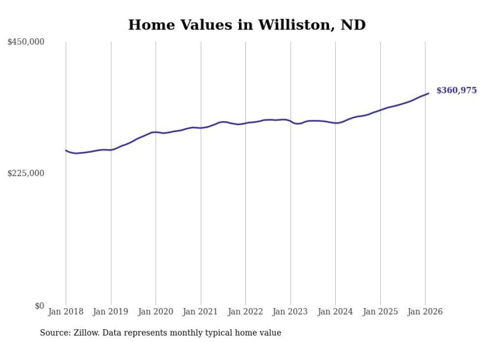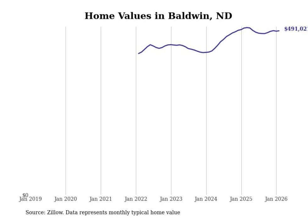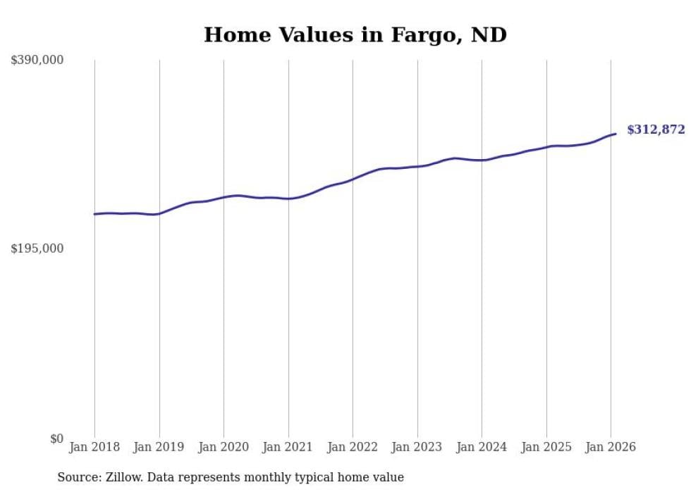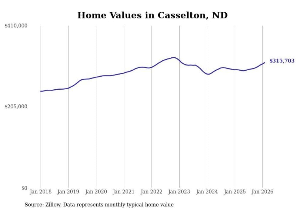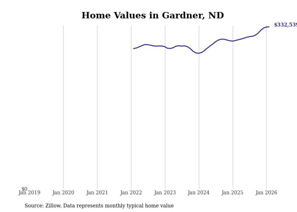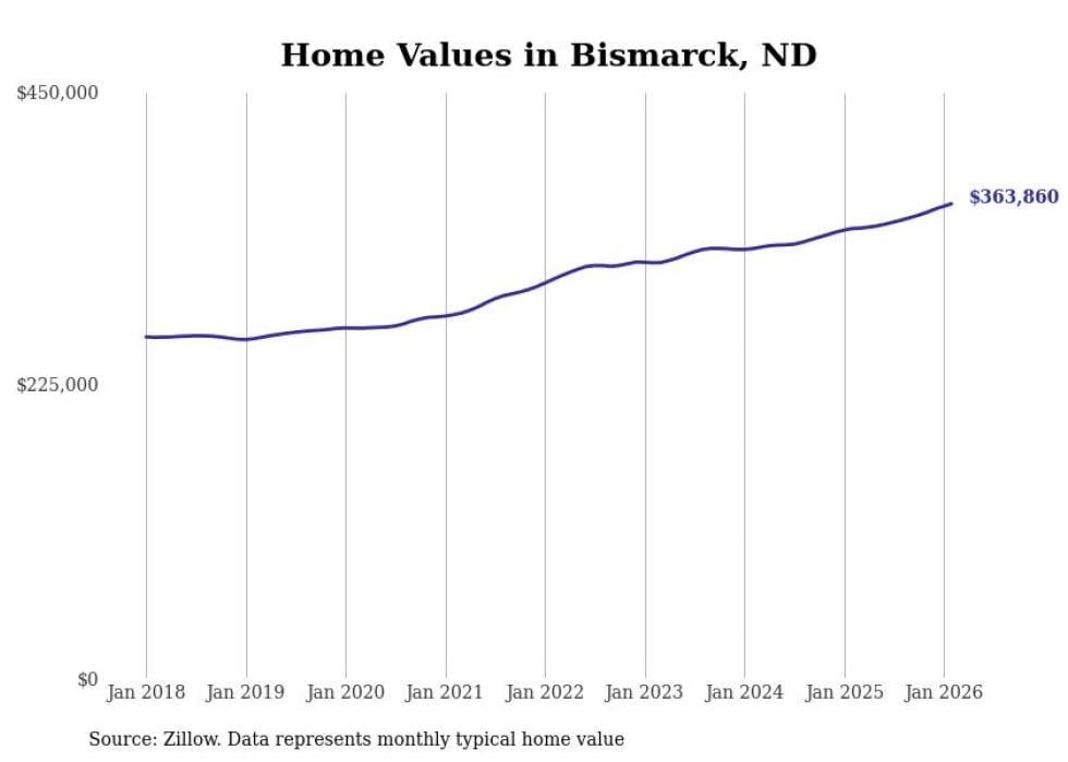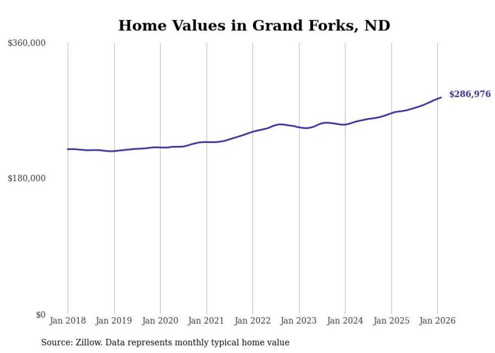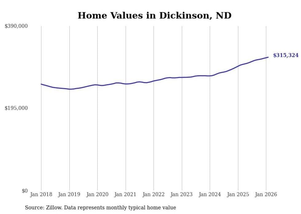 compiled a list of cities with the most expensive homes in North Dakota using data from . Cities are ranked by the Zillow Home Values Index for all homes as of February 2026. The charts in this story were created automatically using .