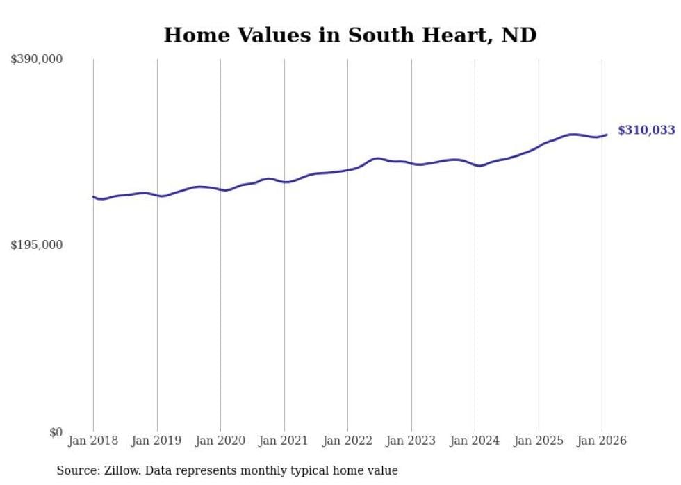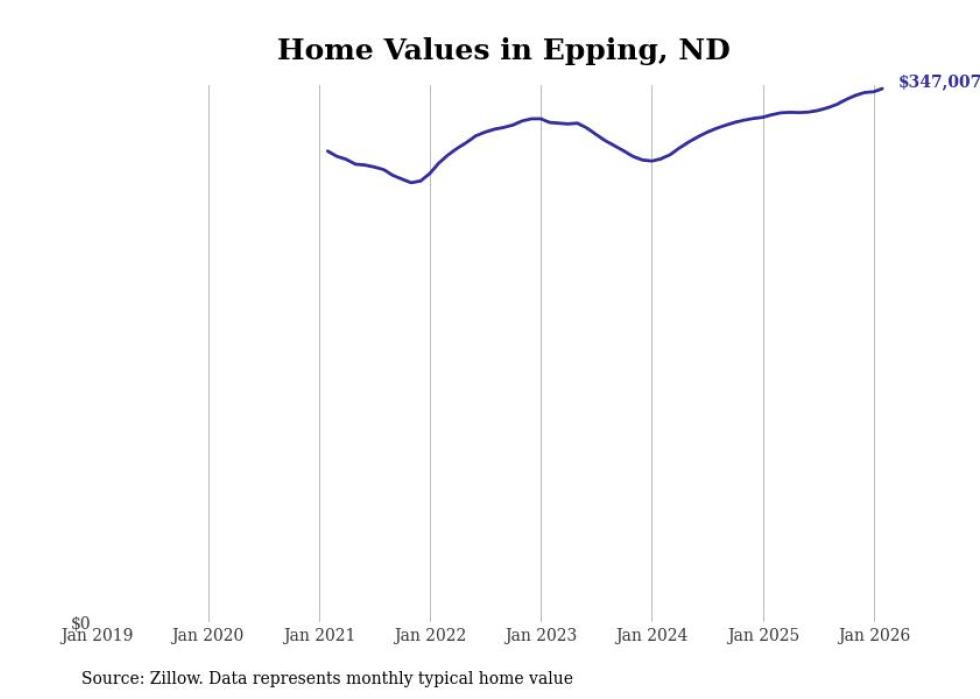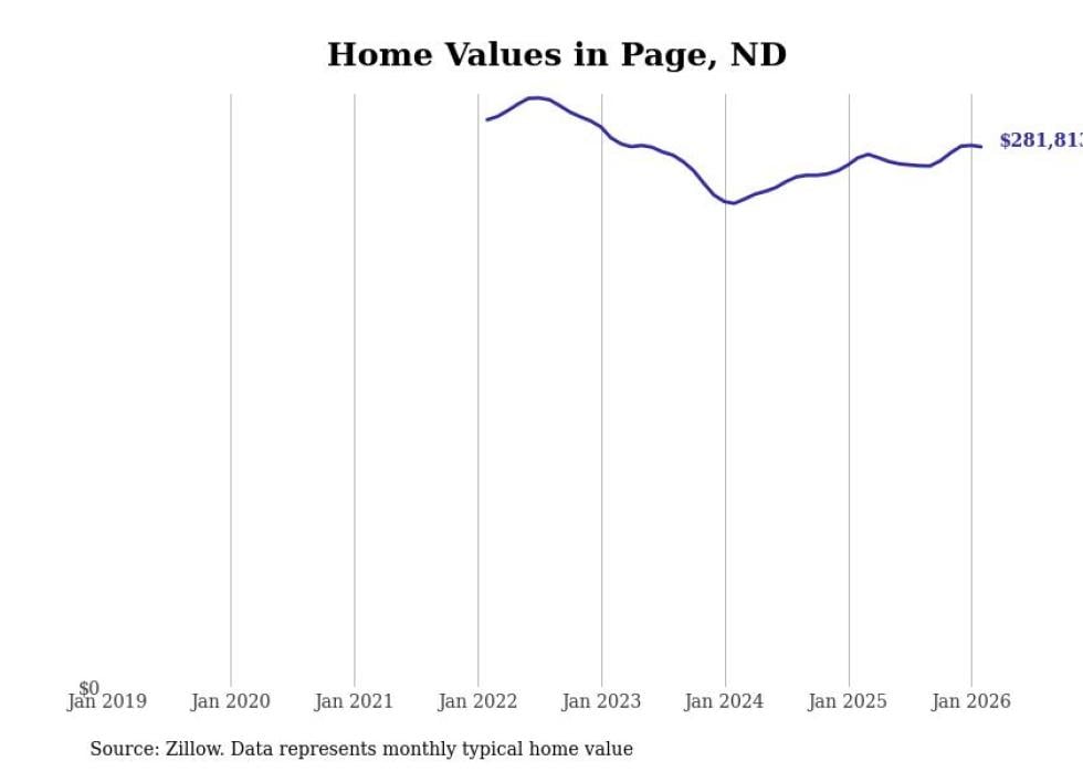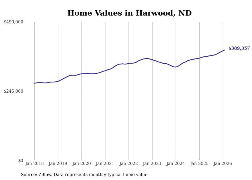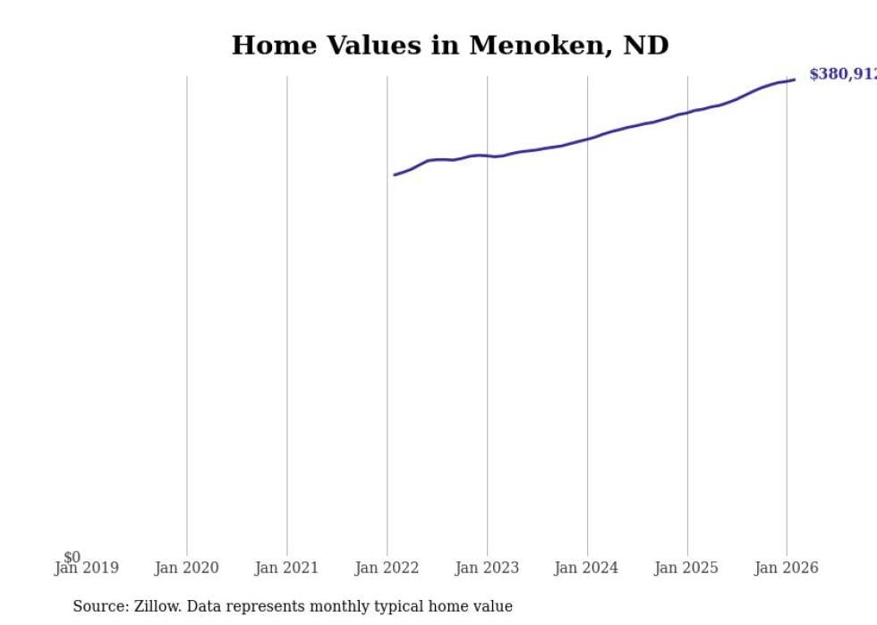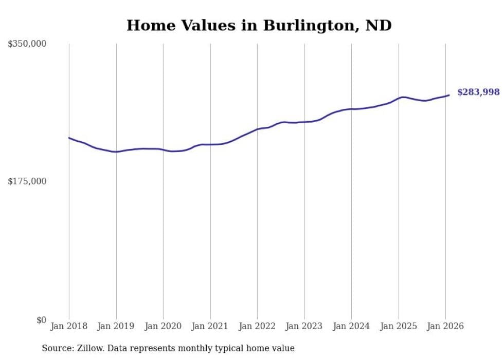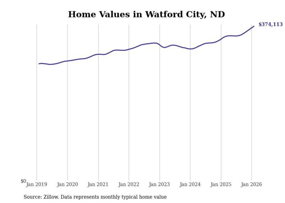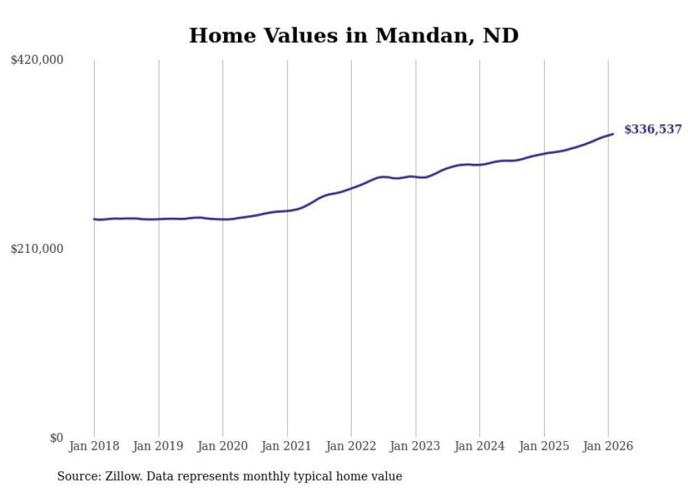 compiled a list of cities with the most expensive homes in North Dakota using data from . Cities are ranked by the Zillow Home Values Index for all homes as of February 2026. The charts in this story were created automatically using .