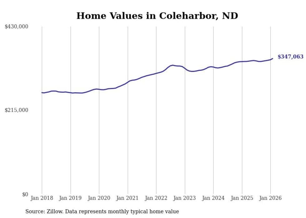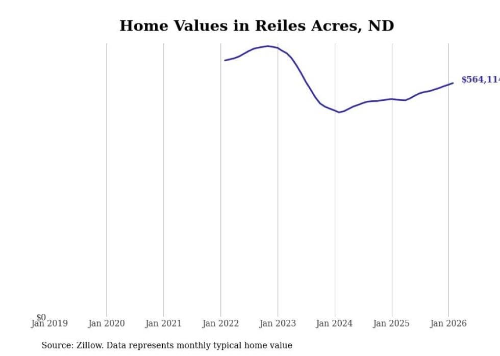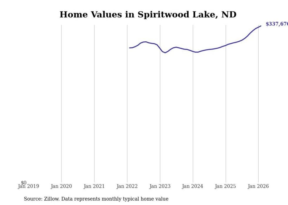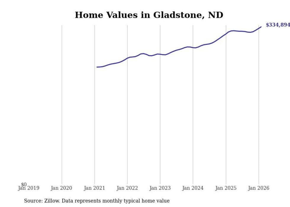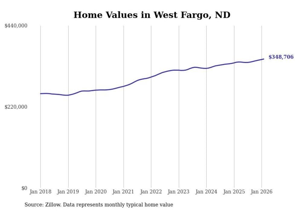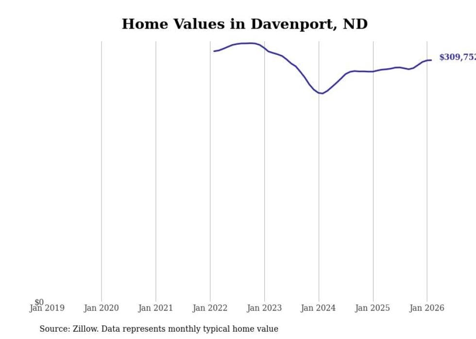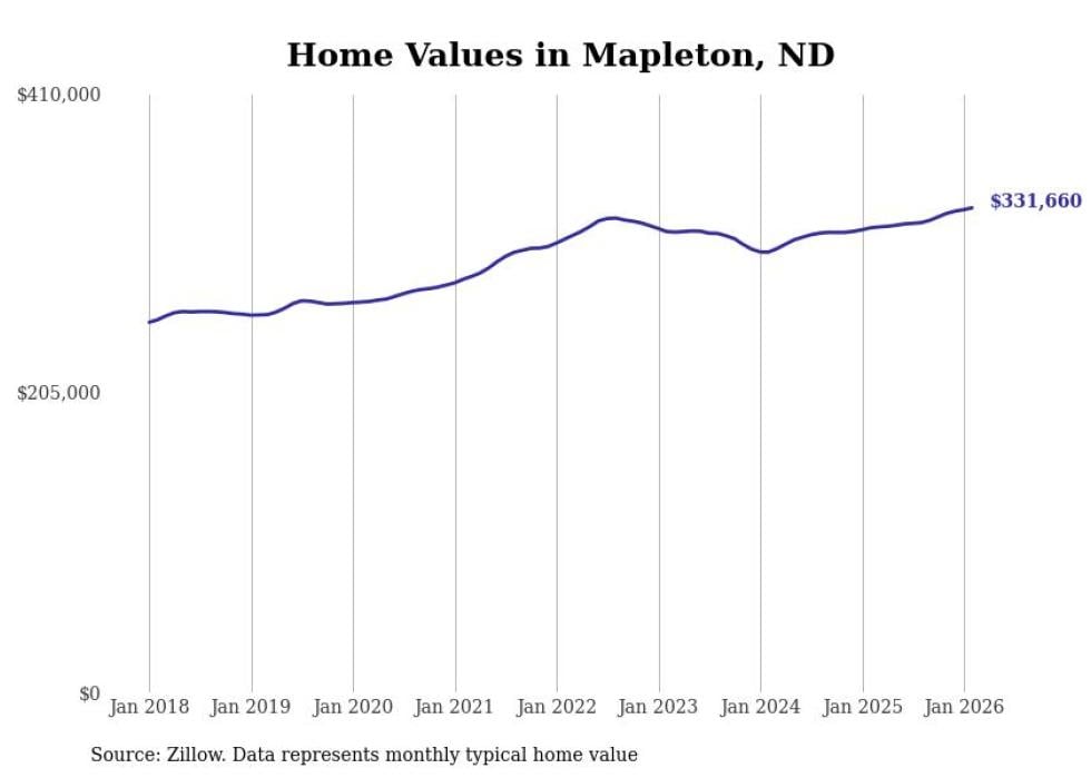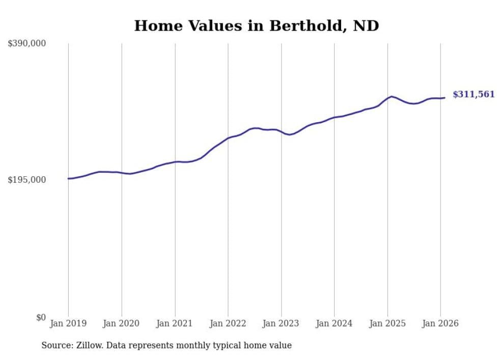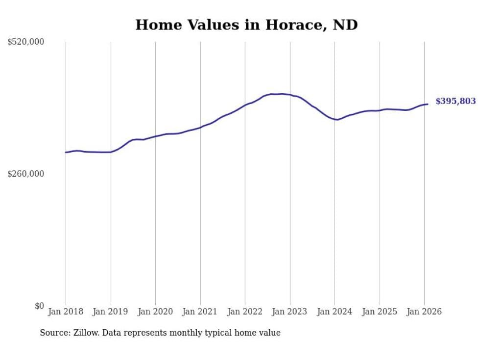 compiled a list of cities with the most expensive homes in North Dakota using data from . Cities are ranked by the Zillow Home Values Index for all homes as of February 2026. The charts in this story were created automatically using .